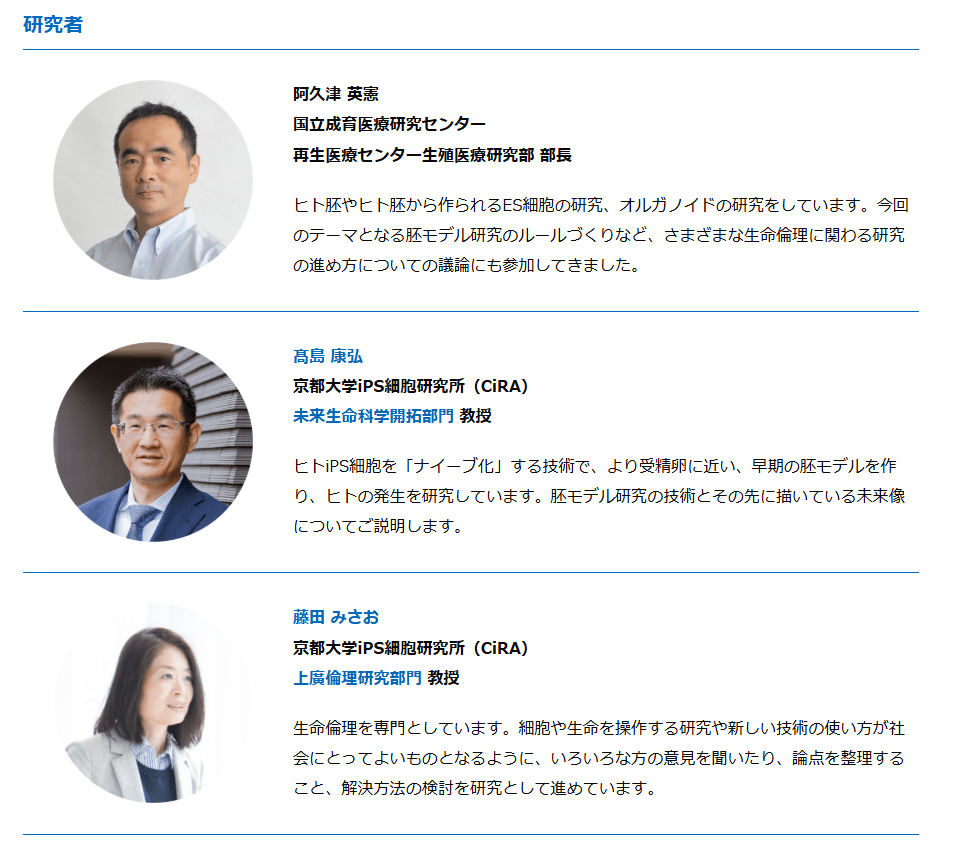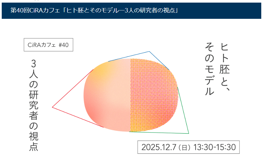 2025年12月7日(日)13:30〜15:30に第40回CiRAカフェ「ヒト胚とそのモデル―3人の研究者の視点」を開催しますので、申し込みの上、ぜひお越しになってください。